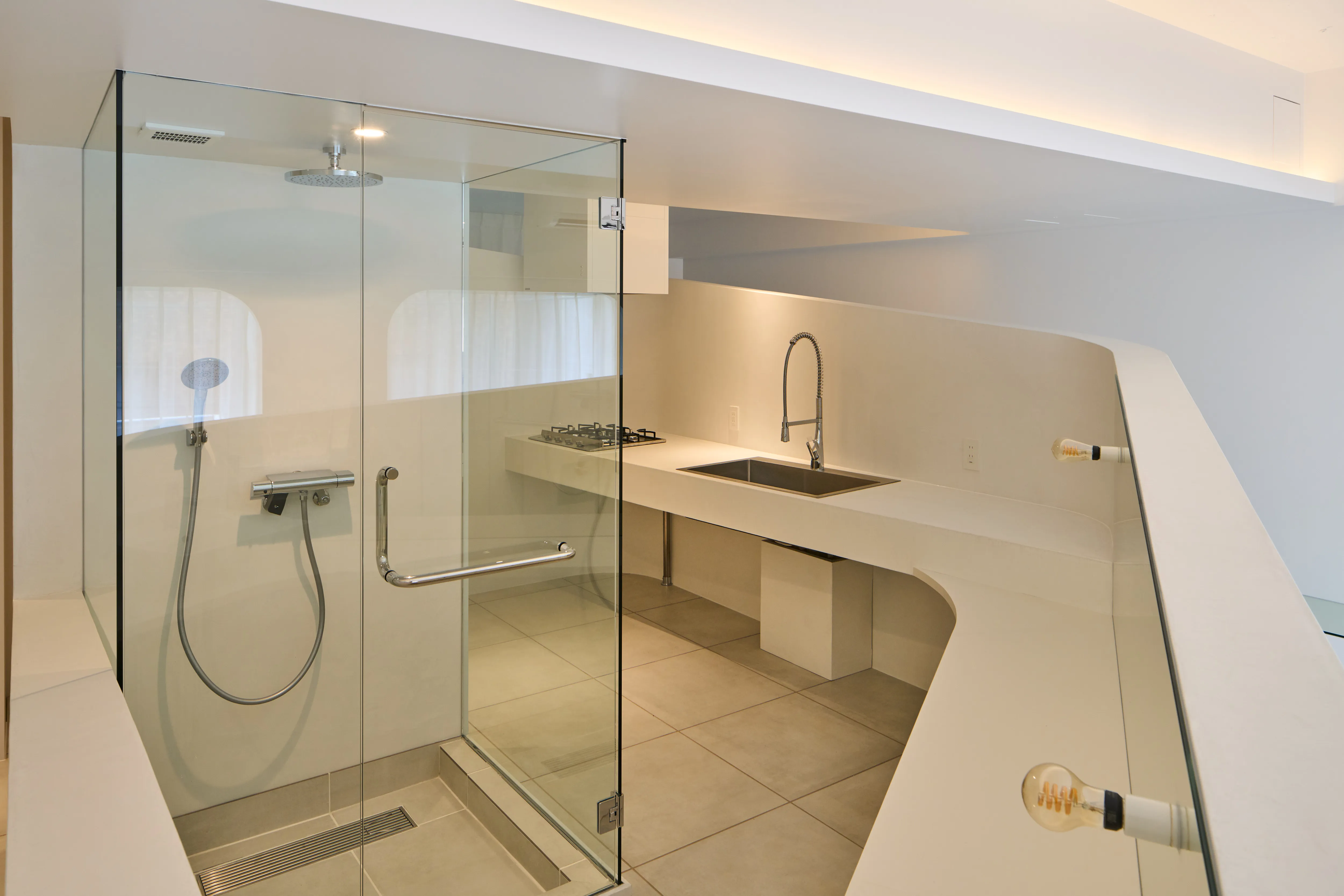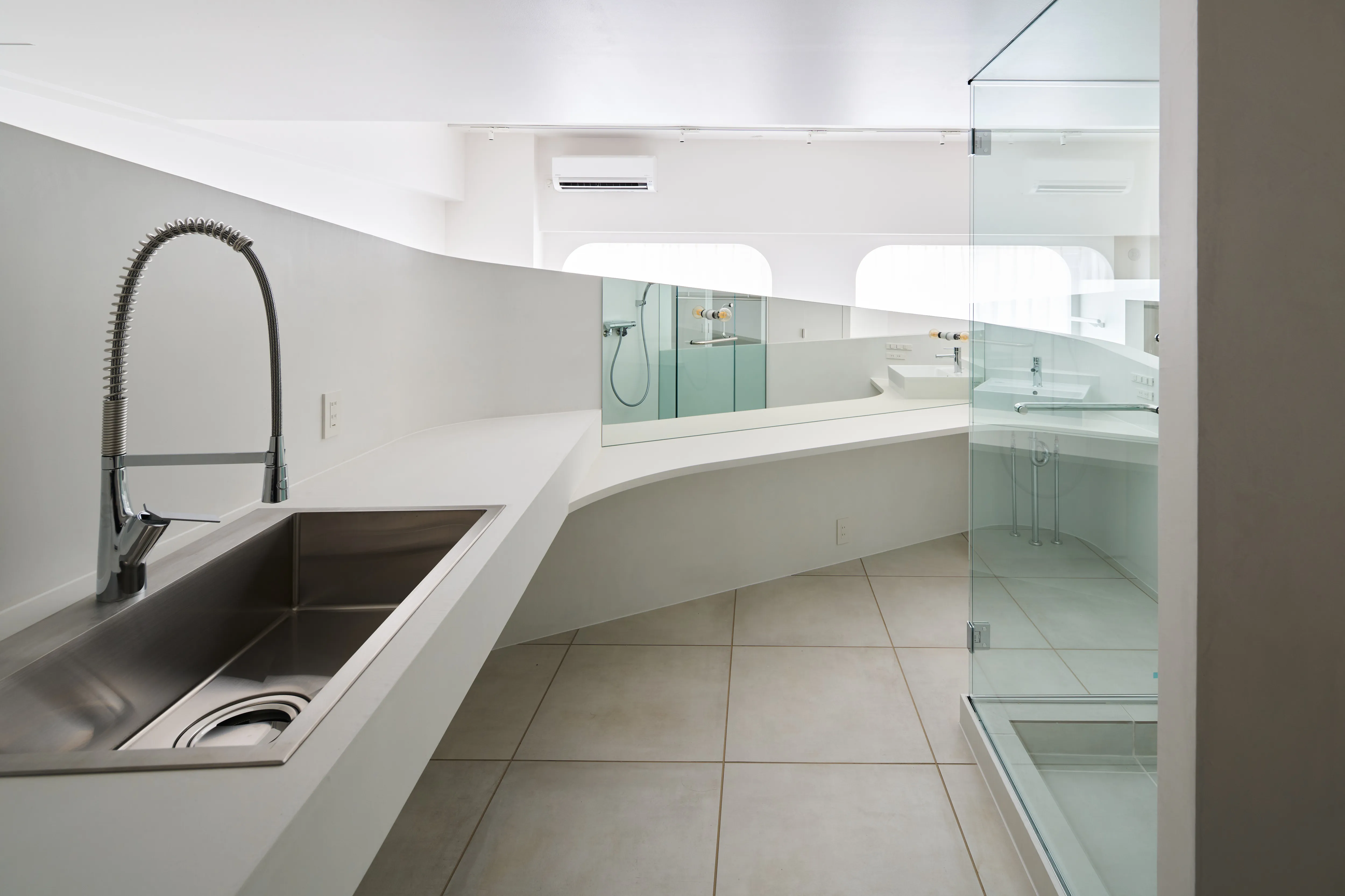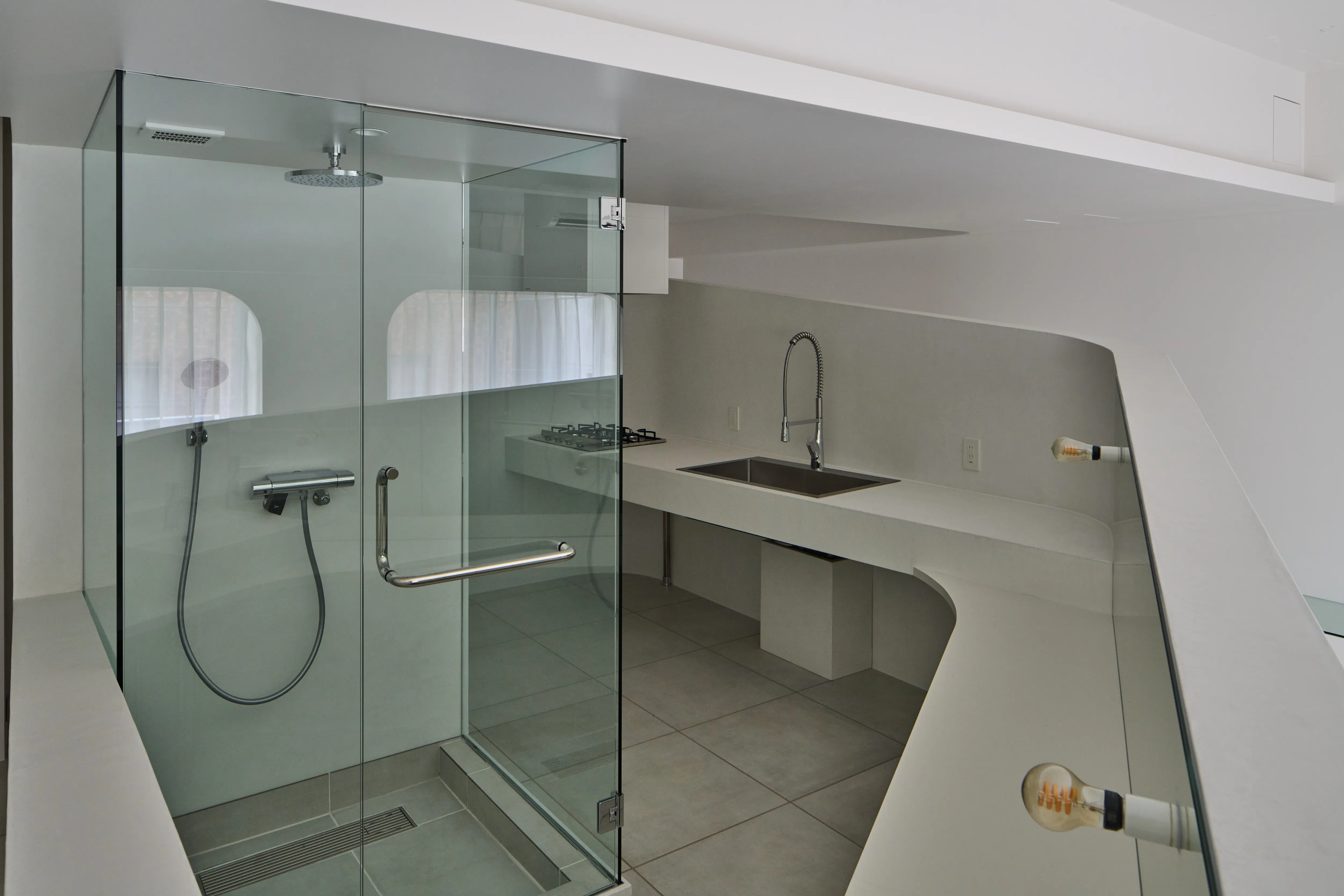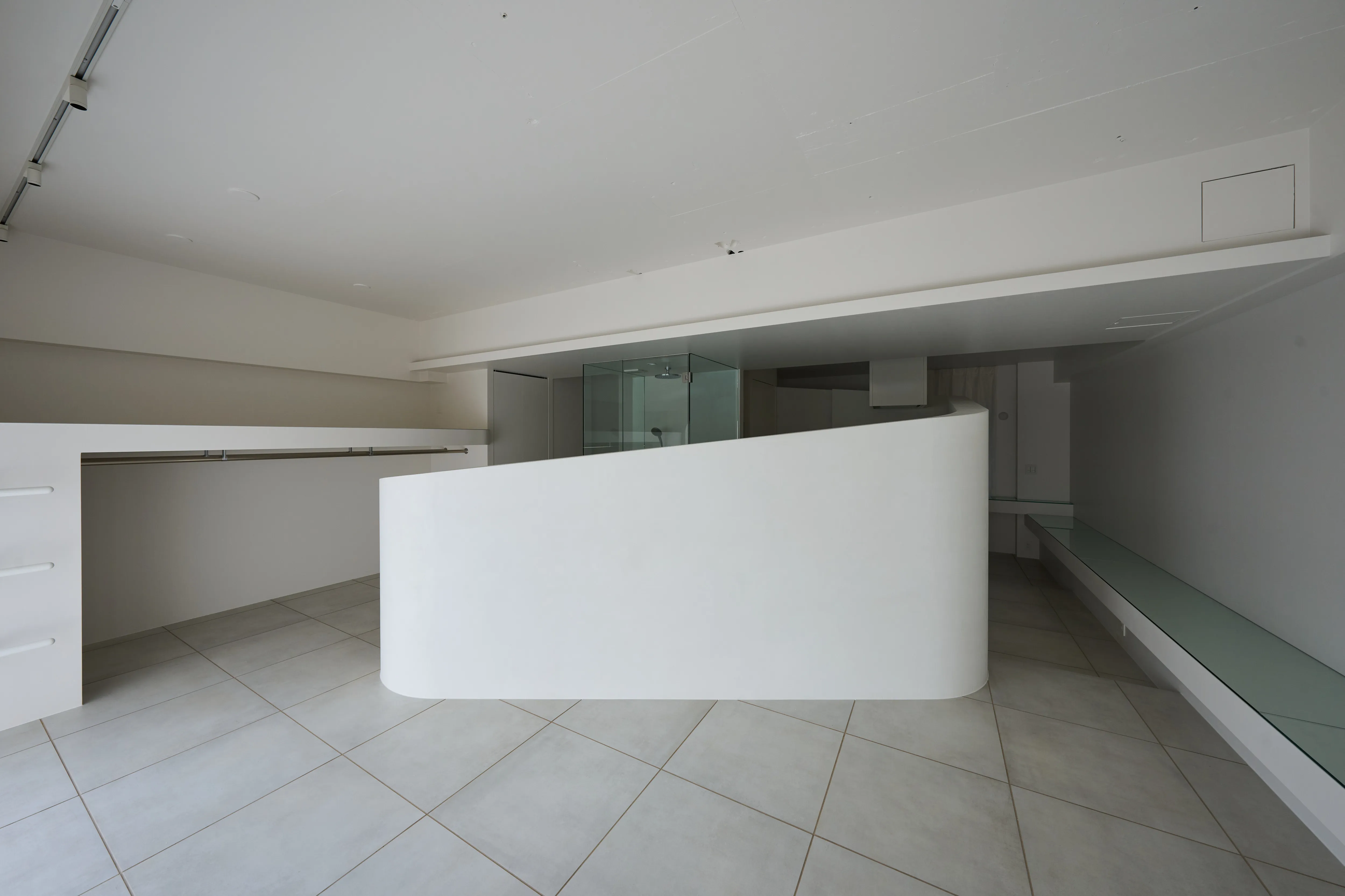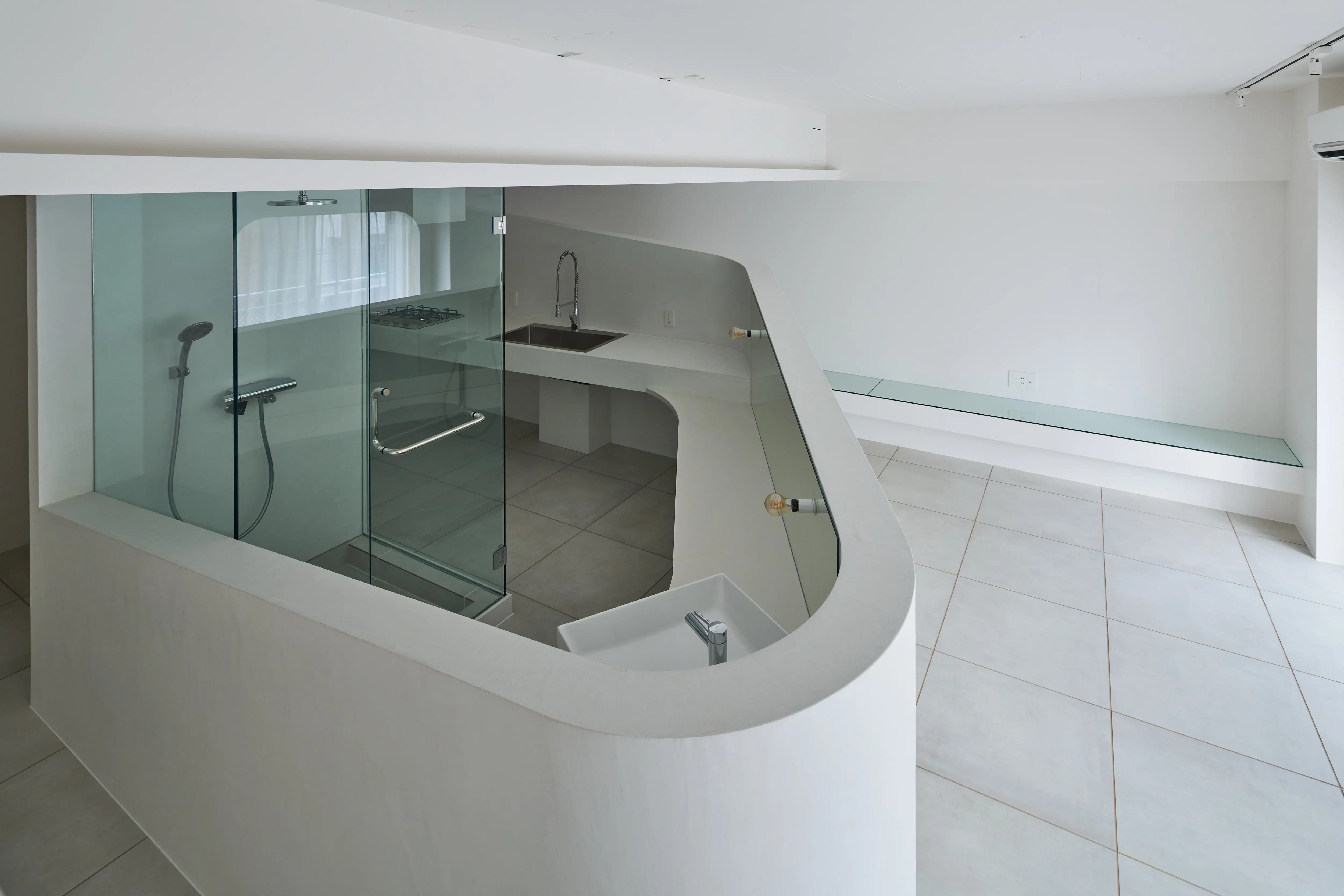 特に目を引く要塞のような、そしてゆるやかに低くなっていく曲線の壁は美しく、その内側にはキッチン設備と洗面台が隠されており、そして渦を巻いた動線の中心にあるシャワールームは作中の“モノリス”を表現しています。