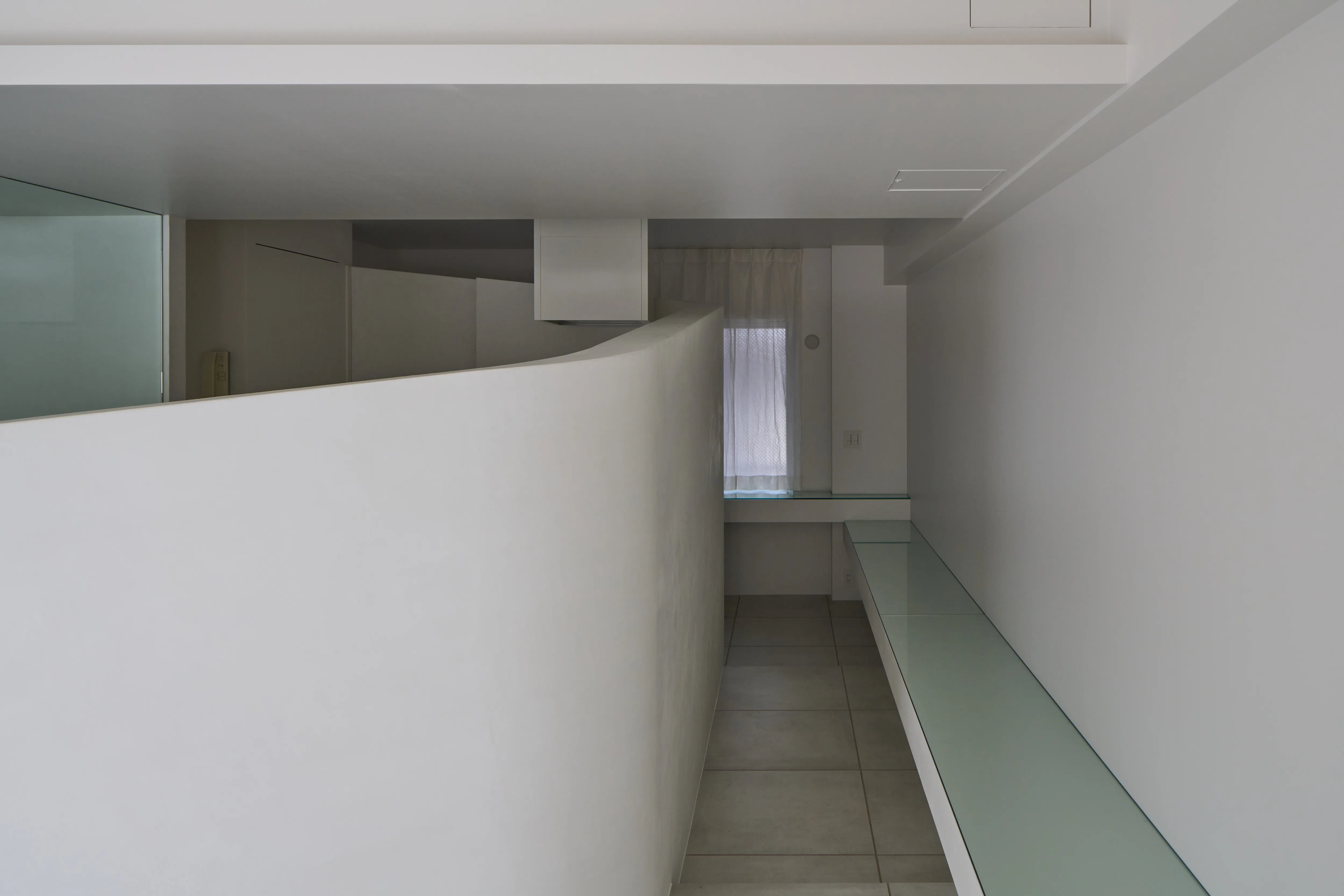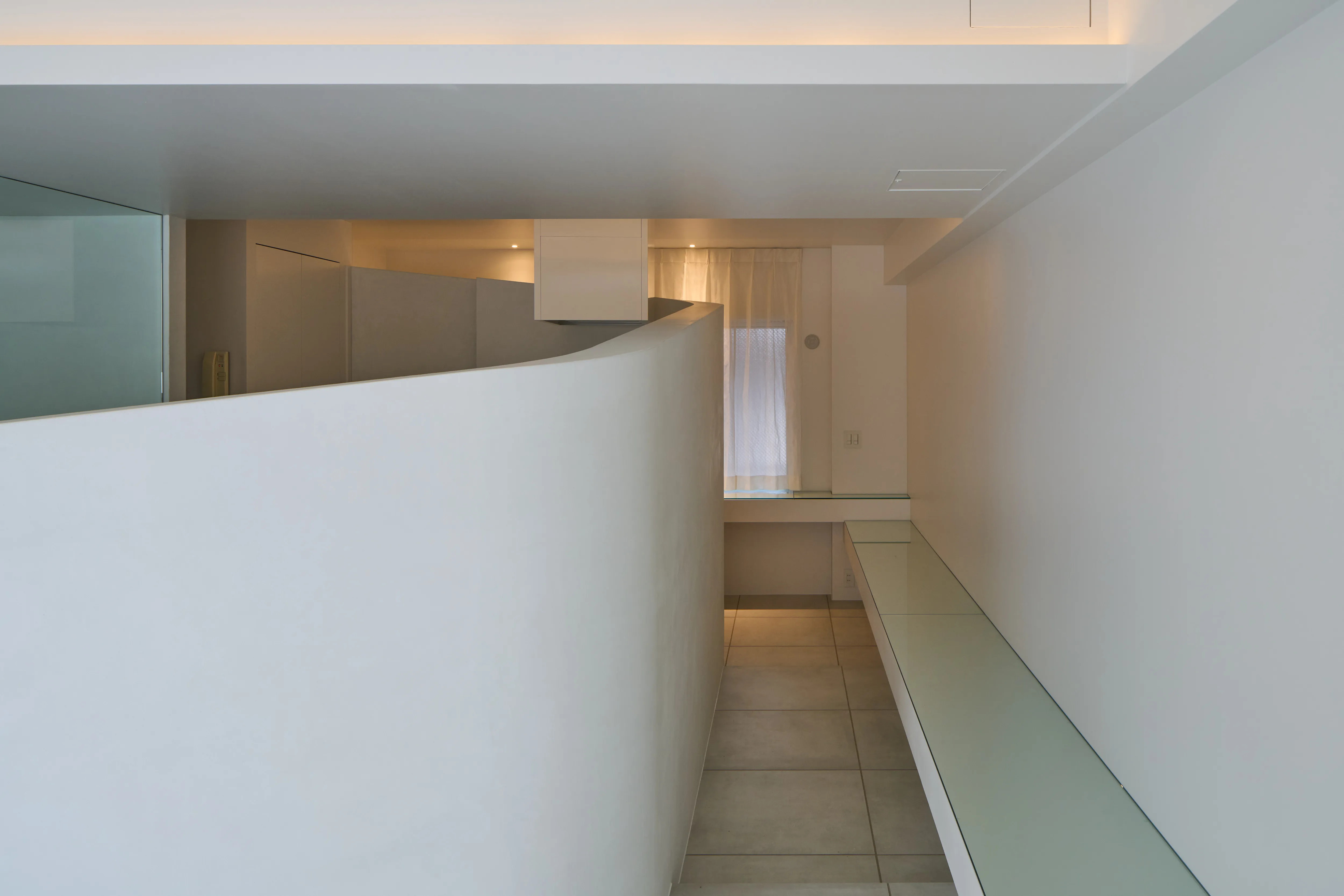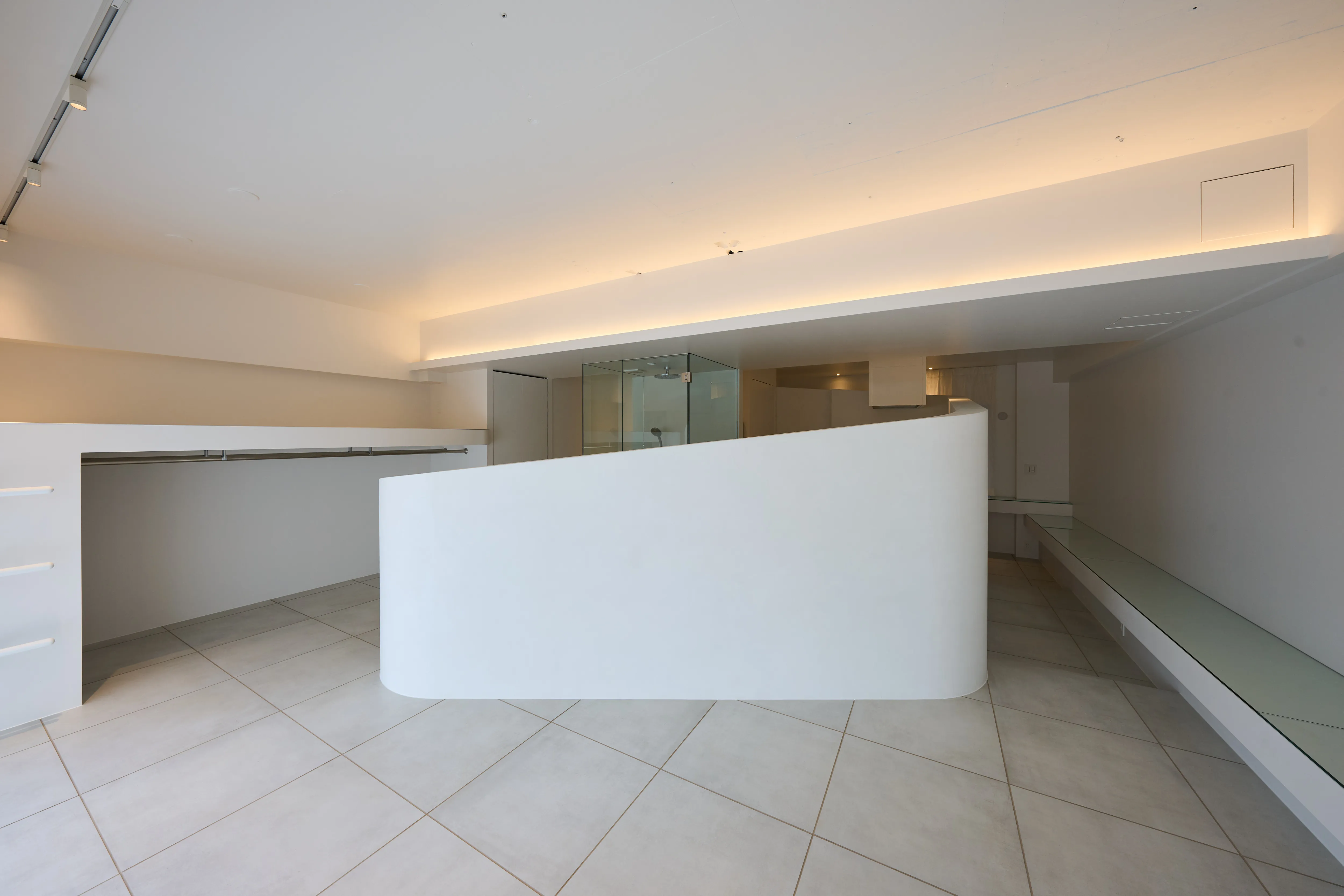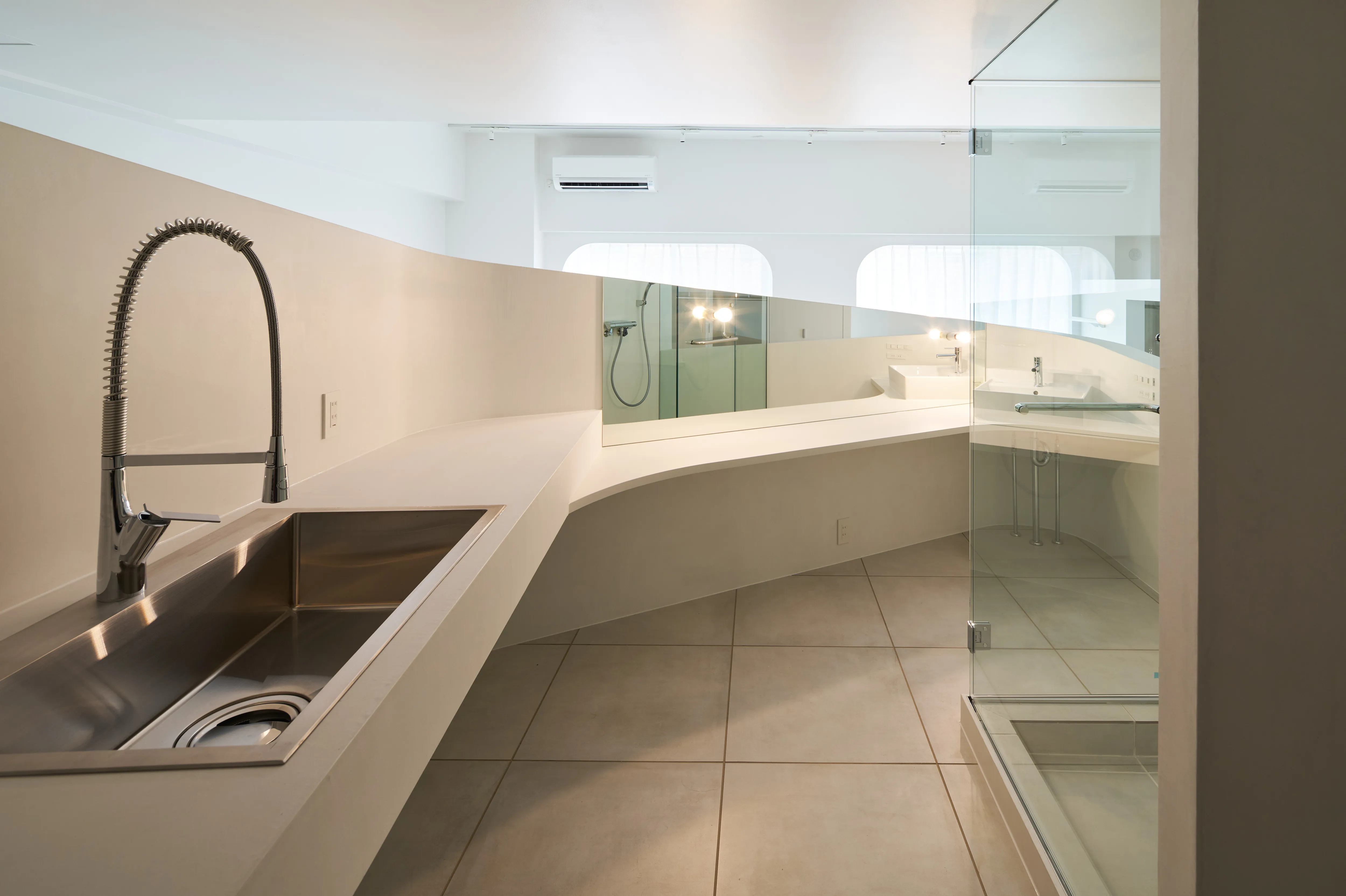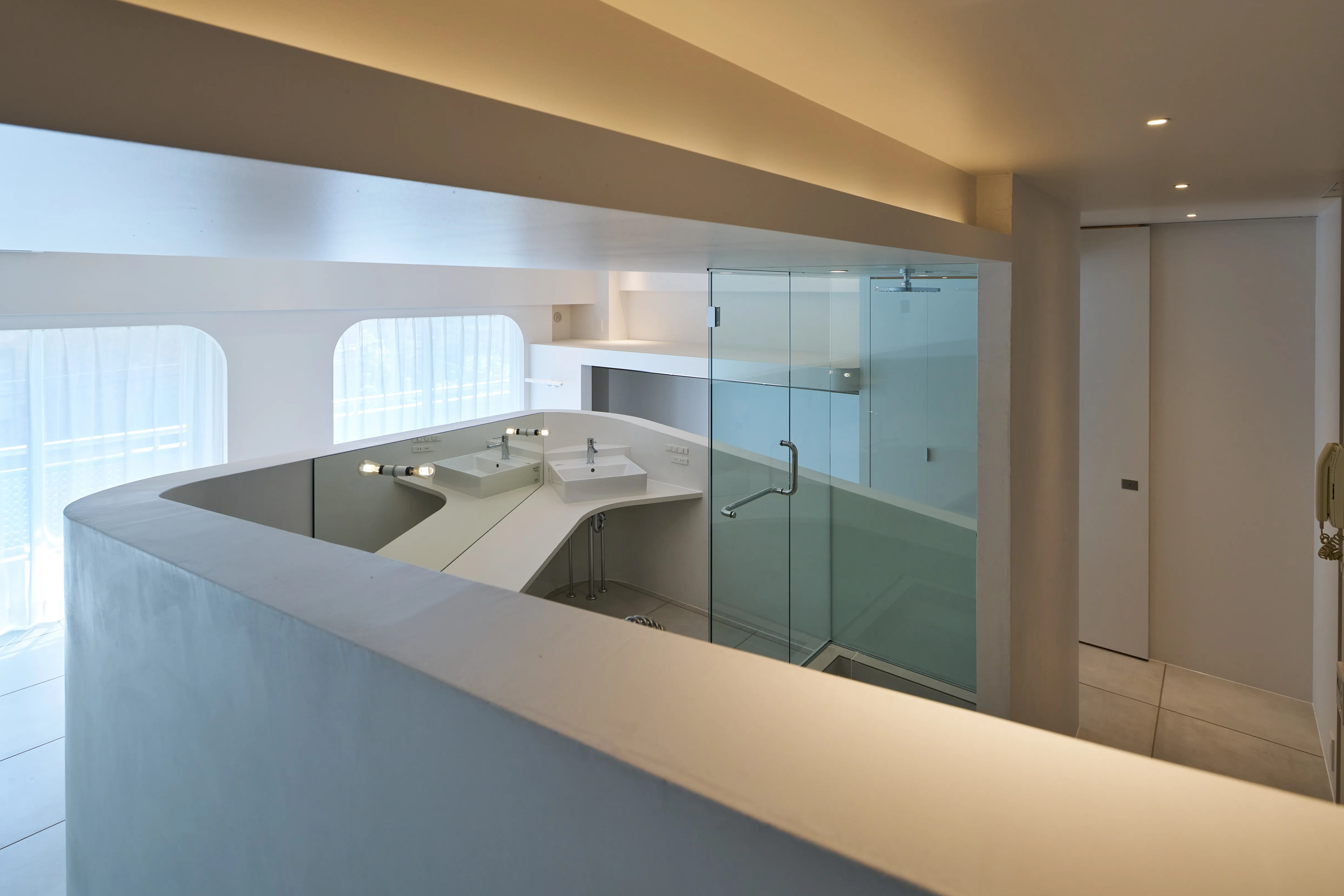 特に目を引く要塞のような、そしてゆるやかに低くなっていく曲線の壁は美しく、その内側にはキッチン設備と洗面台が隠されており、そして渦を巻いた動線の中心にあるシャワールームは作中の“モノリス”を表現しています。